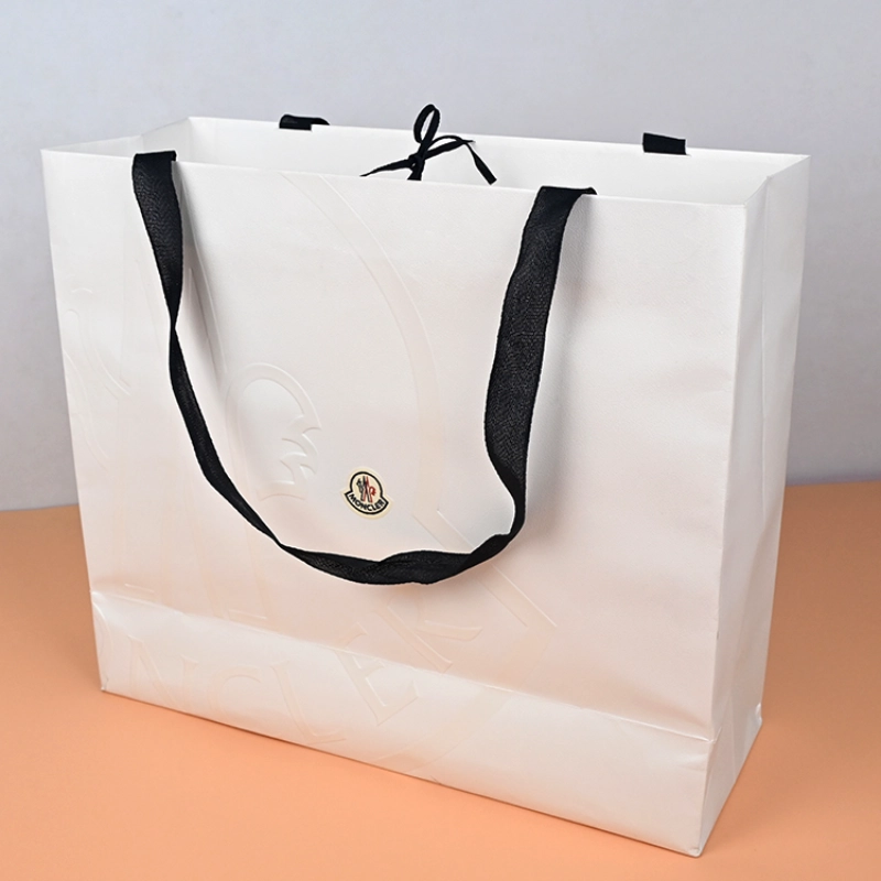 Handle Options: Custom-dyed grosgrain ribbons, herringbone cotton tapes, twisted paper handles, die-cut “J-cut” handles, or luxury satin cords. Handles can be finished with plastic/metal aglets or knotted through reinforced eyelets.